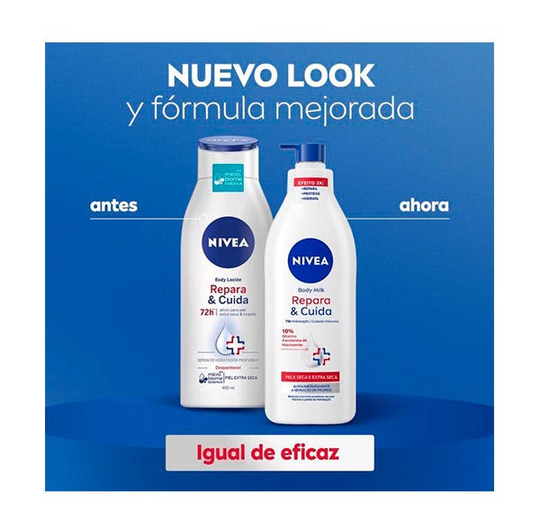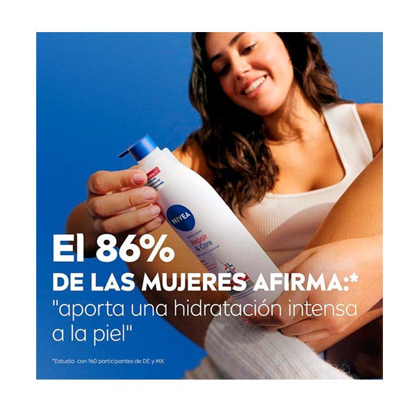 NIVEA Repara y Cuida loción corporal 10% con glicerina, provitamina B5 y niacinamida para piel seca y extra seca, su fórmula de rápida absorción alivia inmediatamente la sensación de picor en la piel, para una piel de aspecto saludable. Además, refuerza la barrera protectora de la piel previniendo la pérdida de hidratación e hidrata la piel en profundidad durante 72h. Compatibilidad con la piel dermatológicamente comprobada. Para mejores resultados aplicar diariamente por todo el cuerpo.
