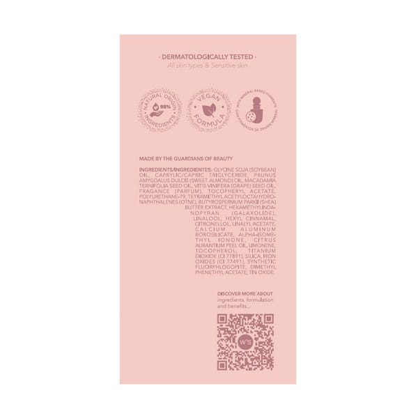 INGREDIENTS/INGREDIENTES: GLYCINE SOJA (SOYBEAN) OIL, CAPRYLIC/CAPRIC TRIGLYCERIDE, PRUNUS AMYGDALUS DULCIS (SWEET ALMOND) OIL, MACADAMIA TERNIFOLIA SEED OIL, VITIS VINIFERA (GRAPE) SEED OIL, FRAGANCE (PARFUM), TOCOPHERYL ACETATE, POLYURETHANE-79, TETRAMETHYL ACETYLOCTAHYDRONAPHTHALENES (OTNE), BUTYROSPERMUM PARKII (SHEA) BUTTER EXTRACT, HEXAMETHYLINDANOPYRAN (GALAXOLIDE), LINALOOL, HEXYL CINNAMAL, CITRONELLOL, LINALYL ACETATE, CALCIUM ALUMINUM BOROSILICATE, ALPHA-ISOMETHYL IONONE, CITRUS AURANTIUM PEEL OIL, LIMONENE, TOCOPHEROL, TITANIUM DIOXIDE (CI 77891), SILICA, IRON OXIDES (CI 77491), SYNTHETIC FLUORPHLOGOPITE, DIMETHYL PHENETHYL ACETATE, TIN OXIDE.