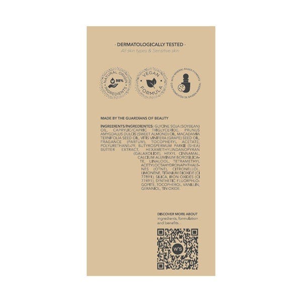 INGREDIENTS/INGREDIENTES: GLYCINE SOJA (SOYBEAN) OIL, CAPRYLIC/CAPRIC TRIGLYCERIDE, PRUNUS AMYGDALUS DULCIS (SWEET ALMOND) OIL, MACADAMIA TERNIFOLIA SEED OIL, VITIS VINIFERA (GRAPE) SEED OIL, FRAGANCE (PARFUM), TOCOPHERYL ACETATE, POLYURETHANE-79, BUTYROSPERMUM PARKII (SHEA) BUTTER EXTRACT, HEXAMETHYLINDANOPYRAN (GALAXOLIDE), HEXYL CINNAMAL, CALCIUM ALUMINUM BOROSILICATE, LINALOOL, TETRAMETHYL ACETYLOCTAHYDRONAPHTHALENES (OTNE), CITRONELLOL, LIMONENE, TITANIUM DIOXIDE (CI 77891), SILICA, IRON OXIDES (CI 77491), SYNTHETIC FLUORPHLOGOPITE, TOCOPHEROL, VANILLIN, GERANIOL, TIN OXIDE.
