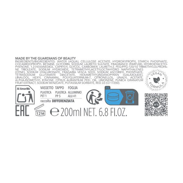 INGREDIENTS/INGREDIENTES: WATER (AQUA), CELLULOSE ACETATE, HYDROXYPROPYL STARCH PHOSPHATE, COCAMIDOPROPYL BETAINE, GLYCERIN, SODIUM LAURETH SULFATE, FRAGRANCE (PARFUM), HYDROXYACETOPHENONE, 1,2-HEXANEDIOL, CAPRYLYL GLYCOL, CARBOMER, LAURETH-2, PEG/PPG-120/10 TRIMETHYLOLPROPANE TRIOLEATE, SODIUM HYDROXIDE, TETRAMETHYLACETYLOCTAHYDRO NAPHTHALENES (OTNE), SODIUM HYALURONATE, FRAGARIA VESCA SEED, SODIUM ASCORBYL PHOSPHATE, TETRASODIUM GLUTAMATE DIACETATE, HEXAMETHYLINDANOPYRAN (GALAXOLIDE), LINALOOL, HEXYL CINNAMAL, POLYQUATERNIUM-7, CITRONELLOL, LINALYL ACETATE, ALPHA-ISOMETHYL IONONE, CITRUS AURANTIUM PEEL OIL, LIMONENE, PUNICA GRANATUM FRUIT EXTRACT, SODIUM BENZOATE, POTASSIUM SORBATE, RED 33 (CI 17200).