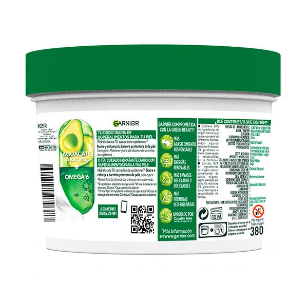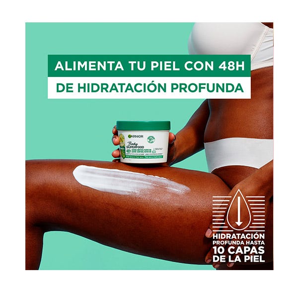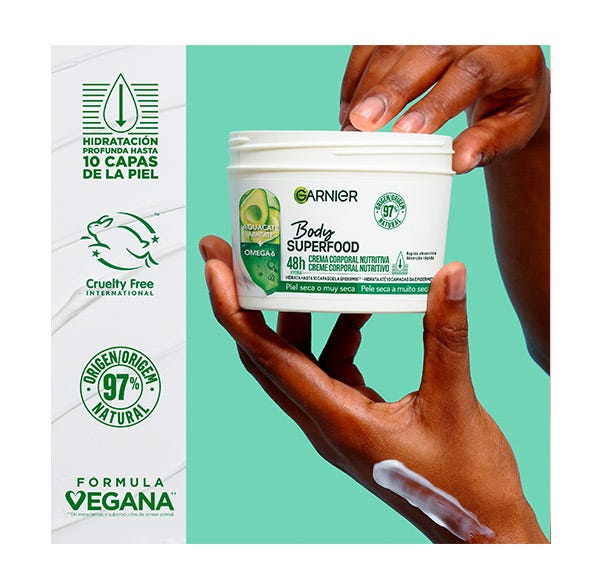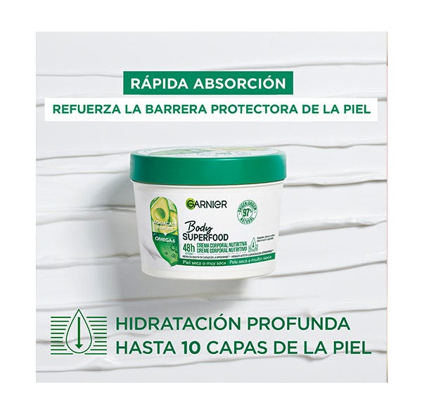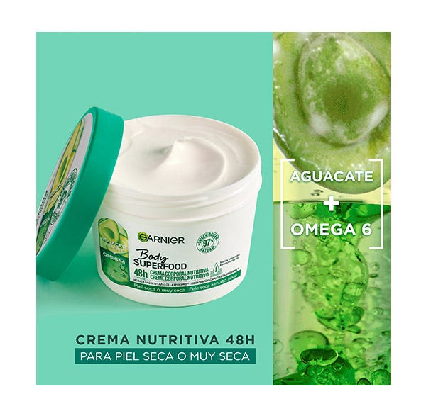 Garnier Body Superfood Crema Corporal Nutritiva con Aguacate y Omega 6 Para Pieles Secas. Hidrata hasta 10 capas de la epidermis nutriendo y reforzando la barrera protectora de la piel. Crema de absorción rápida hidratante 48h.
