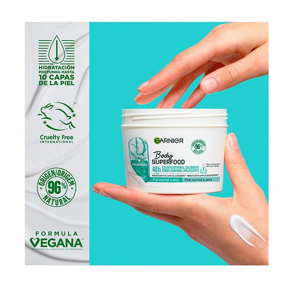 Aplica Garnier Body Superfood Crema Corporal Calmante con Aloe Vera y Magnesio para Pieles de Normales a Secas sobre la piel limpia y seca,