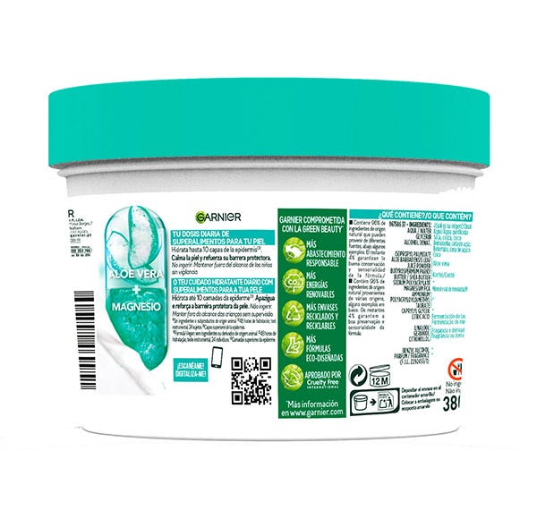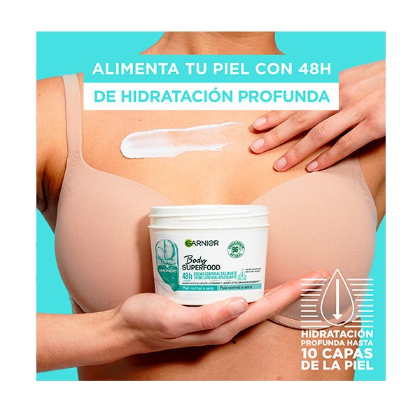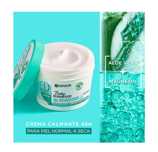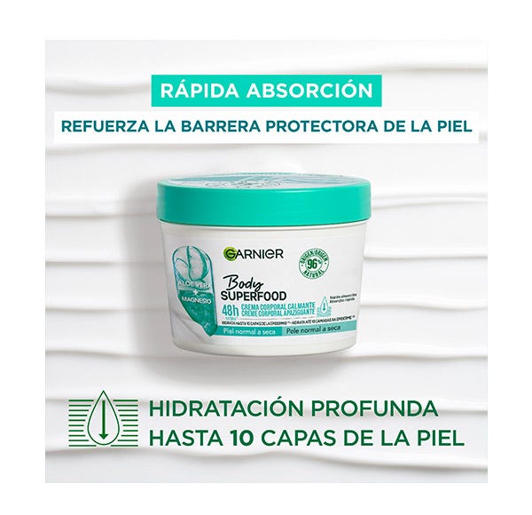 Garnier Body Superfood Crema Corporal Calmante con Aloe Vera y Magnesio para Pieles de Normales a Secas. Penetra hasta 10 capas de la epidermis calmando la piel y reforzando su barrera protectora. Crema de absorción rápida hidratante 48h.