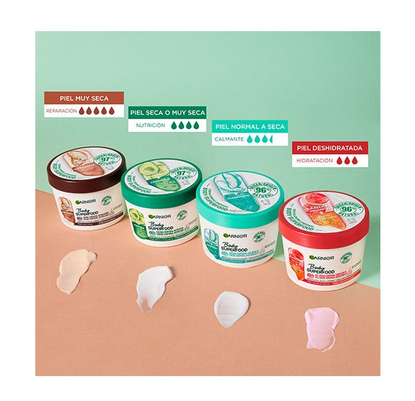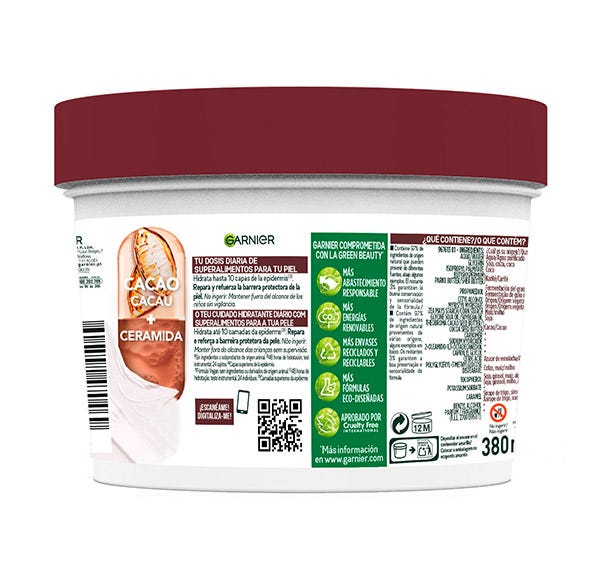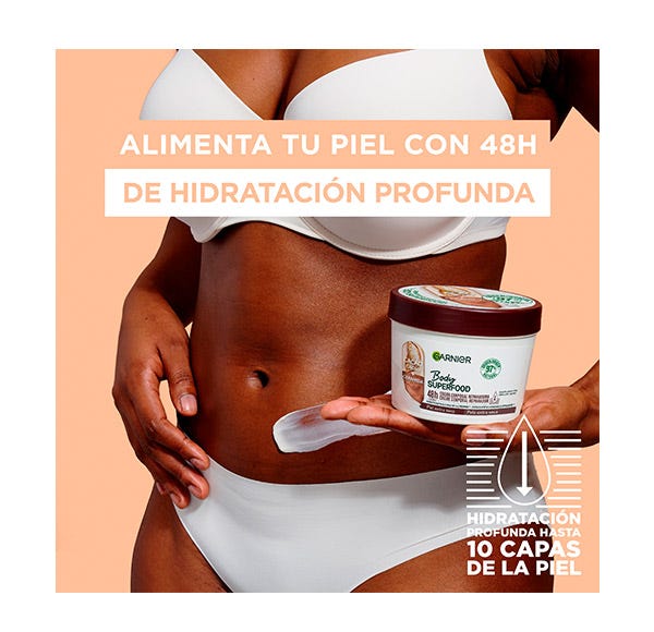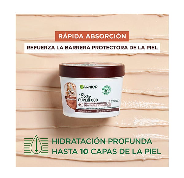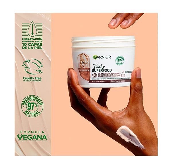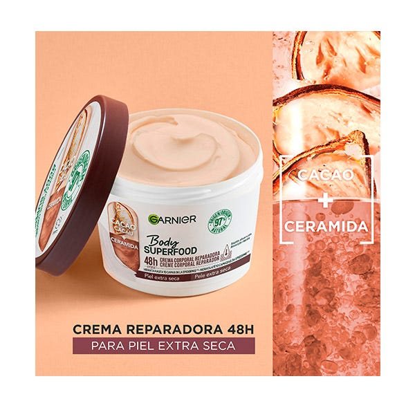 Garnier Body Superfood Crema Corporal Reparadora con Cacao y Ceramida para pieles extra secas. Hidrata hasta 10 capas de la epidermis reparando y reforzando la barrera protectora de la piel. Crema de absorción rápida hidratante 48h.