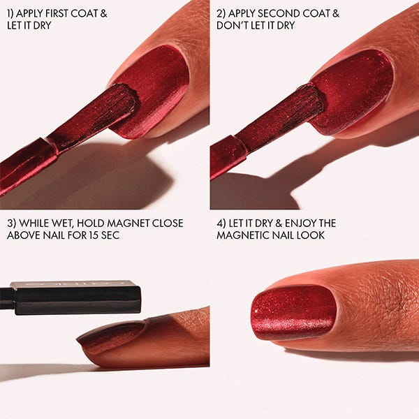 Aplica una primera capa de esmalte de uñas y déjalo secar completamente. Luego, aplica una segunda capa gruesa y, mientras está todavía húmedo, mantén el imán magnético para uñas Catrice Bold sobre la uña a una distancia de 0,5 cm durante al menos 15 segundos. Ajusta el ángulo para lograr diferentes efectos. Dejea que se seque completamente y omite la capa superior para preservar el patrón magnético.