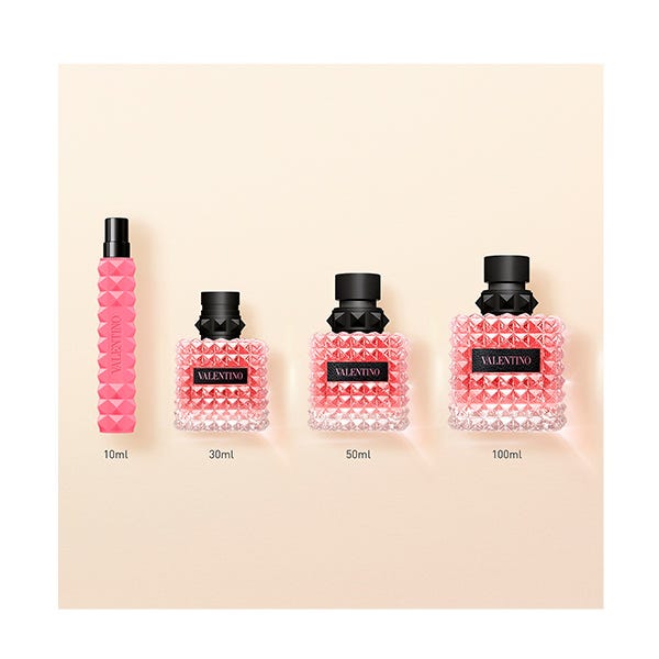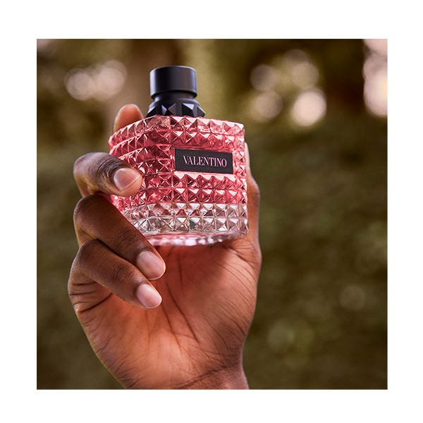 El frasco esta cubierto con los icónicos studs, tachuelas inspiradas por la arquitectura de Roma, que son la firma característica de Valentino. Estos envuelven también el cuello del frasco convirtiéndolo en un accesorio de moda.