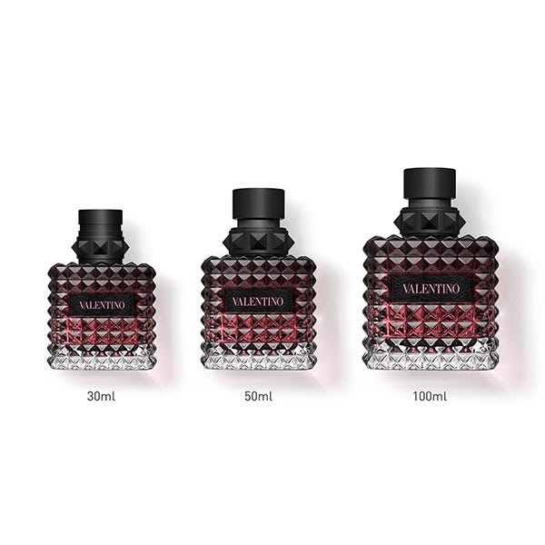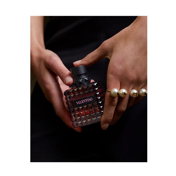 El frasco rinde homenaje al icónico Rockstud de Valentino. Este atrevido diseño piramidal, inspirado en la arquitectura romana, es una firma de la Maison Valentino.