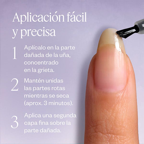 Su tecnología líquido a sólido actúa directamente sobre la rotura: se aplica como un líquido ultrafino que se adhiere a la grieta y, al secar, se convierte en un parche sólido y transparente que une los bordes para un resultado duradero e imperceptible incluso bajo esmalte. Su acabado liso evita irregularidades visibles y permite llevar cualquier color sin que la rotura se note.