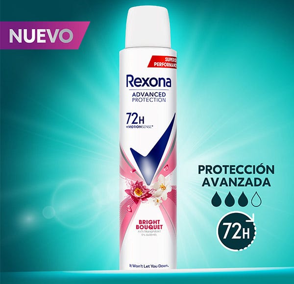 Rexona presenta su nueva fórmula Advanced Protection que brinda protección avanzada de hasta 72 horas, a la vez que te protege contra el mal olor y contra el sudor de forma imparable. Además, su tecnología Motionsense que se activa con el movimiento, proporciona una barrera más fuerte y duradera brindándote más confianza en cada actividad.