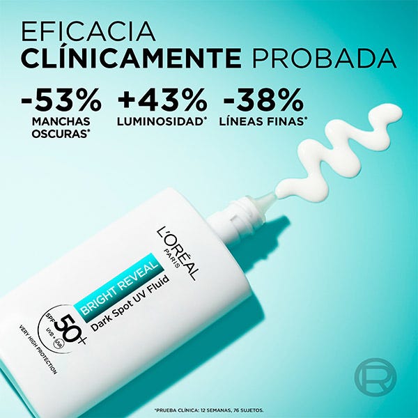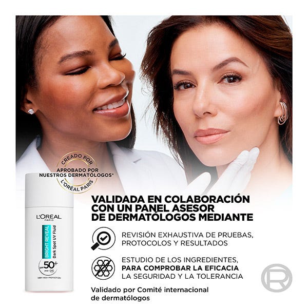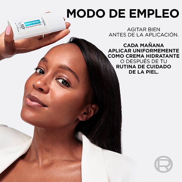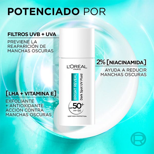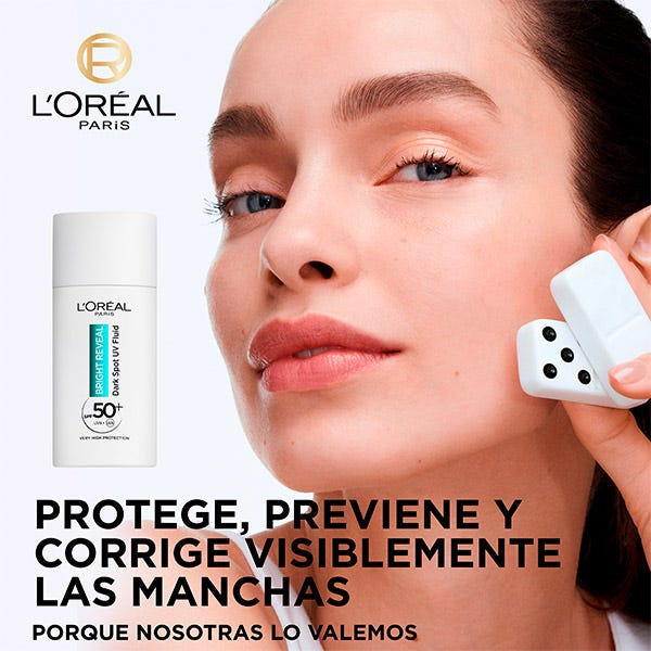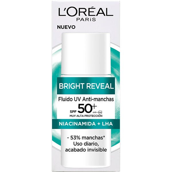 Despierta la luminosidad de tu piel con el Bright Reveal Fluido Hidratante Anti-manchas con Filtro UV SPF50+ y Niacinamida de L'Oréal Paris. Este innovador Fluido diario, de alta protección solar, protege, ayuda a prevenir y corrige visiblemente las manchas.