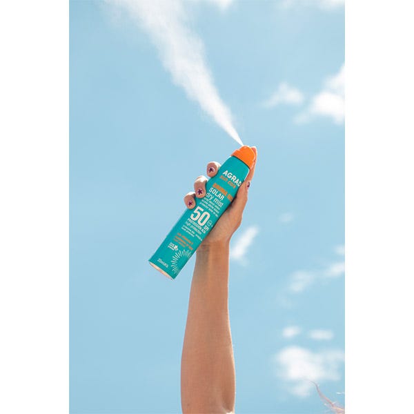 La Bruma Seca Solar Spf 50 en formato spray de Agrado tiene una textura muy ligera de tacto seco y acabado invisible.