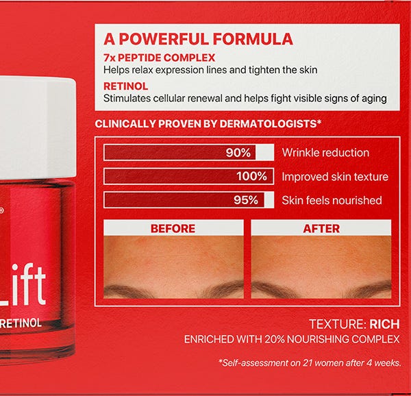 Crema de noche antiarrugas nutritiva, con un complejo avanzado de 7 péptidos y retinol encapsulado.