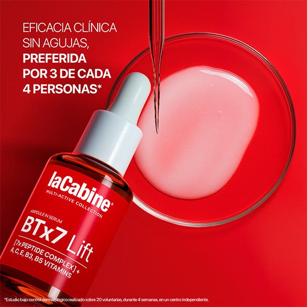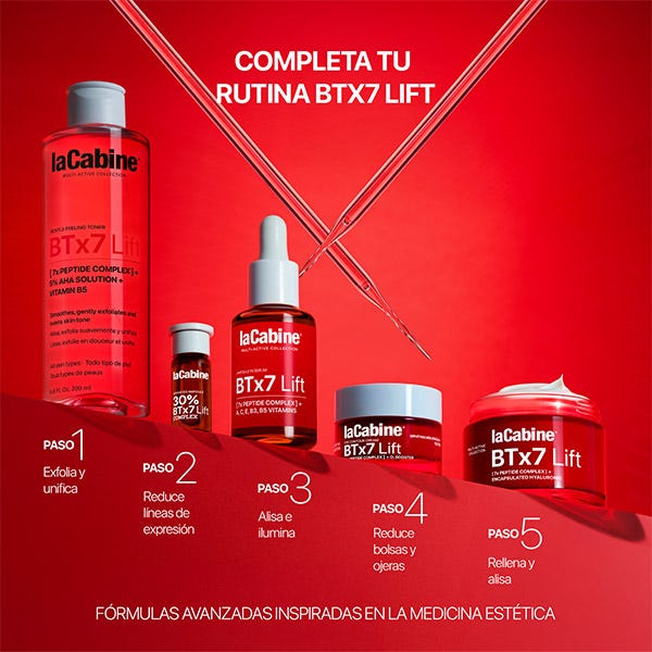 El Sérum Facial BTx7 Lift combina 7 péptidos tensores y un cóctel de vitaminas A, C, E, B3 y B5, inspirado en tratamientos profesionales de inyecciones antiarrugas y mesoterapia. Su aplicación diaria alisa visiblemente las líneas de expresión, mejora la firmeza y potencia la luminosidad de la piel, ofreciendo una alternativa tópica eficaz a los tratamientos médico-estéticos.