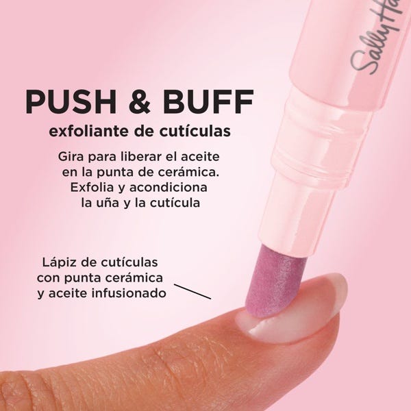 ¡Cutículas cuidadas en un solo paso! Descubre el Push & Buff de Sally Hansen, que exfolia y acondiciona las cutículas de forma sencilla con su fórmula infundida en aceites de Centella Asiática, Almendra Dulce y Albaricoque. Su punta cerámica texturizada pule suavemente y elimina el exceso de piel, dejando las uñas limpias, lisas y con un acabado impecable.
