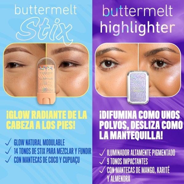 Consigue un resplandor radiante con los Buttermelt Glow Barra Iluminadora Potenciadora de NYX Professional Makeup, el iluminador cremoso y suave como mantequilla que se funde perfectamente con la piel.
