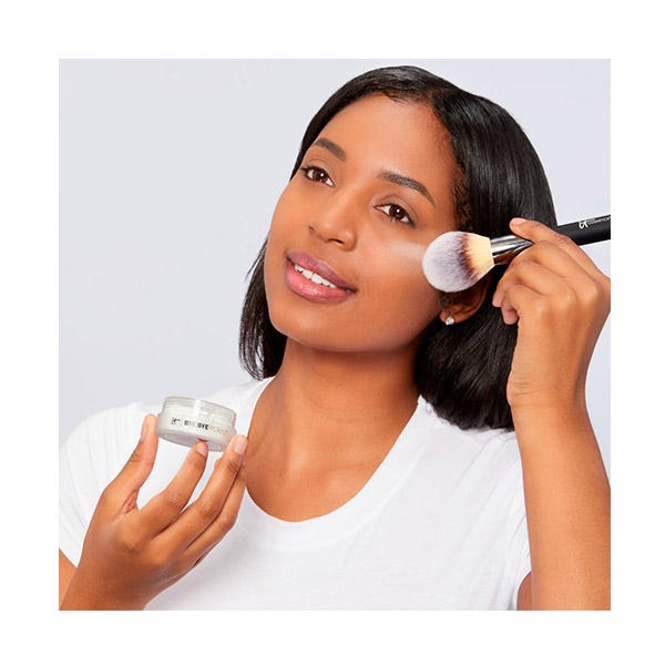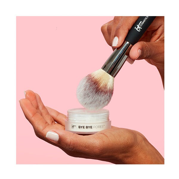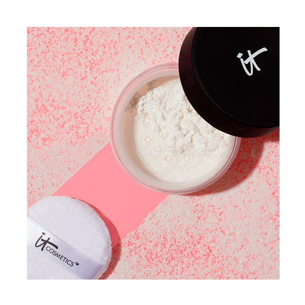 Para controlar la cantidad, vuelca primera una pequeña cantidad en la palma de la mano. Con tu brocha IT COSMETICS favorita, aplica el polvo translucido realizando suaves pasadas controlando el movimiento para que el producto se adhiera a la piel. Se puede usar sobre la piel limpia y sobre la piel maquillada.