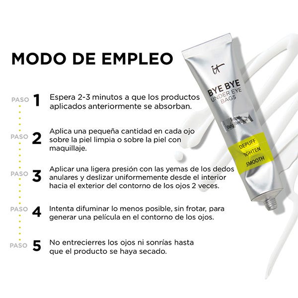 Nota: Si se usa con corrector, base de maquillaje o polvos, Bye Bye Under Eye Bags debe ser el último producto que se aplique encima para que actúe con mayor eficacia.