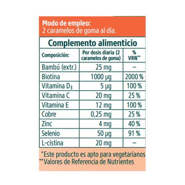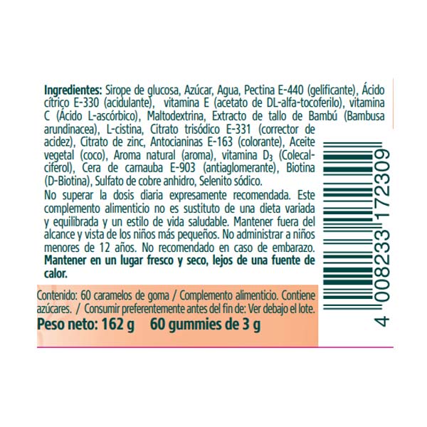 Ingredientes: Sirope de glucosa, Azúcar, Agua, Pectina E-440 (gelificante), Ácido cítrico E-330 (acidulante), vitamina E (acetato de DL-alfa-tocoferilo), vitaminaC (Ácido L-ascórbico), Maltodextrina, extracto de bambú (Bambusa arundinacea), L-cistina, Citrato trisódico E-331(corrector de acidez), Citrato de zinc, Antocianinas E-163 (colorante), Aceite vegetal (coco), Aroma natural (aroma), vitamina D3 (Colecalciferol), Cera de carnauba E-903 (antiaglomerante), Biotina (D-Biotina), Sulfato de cobre anhidro, Selenito sódico.