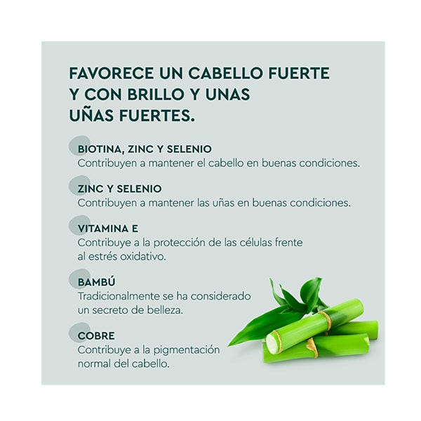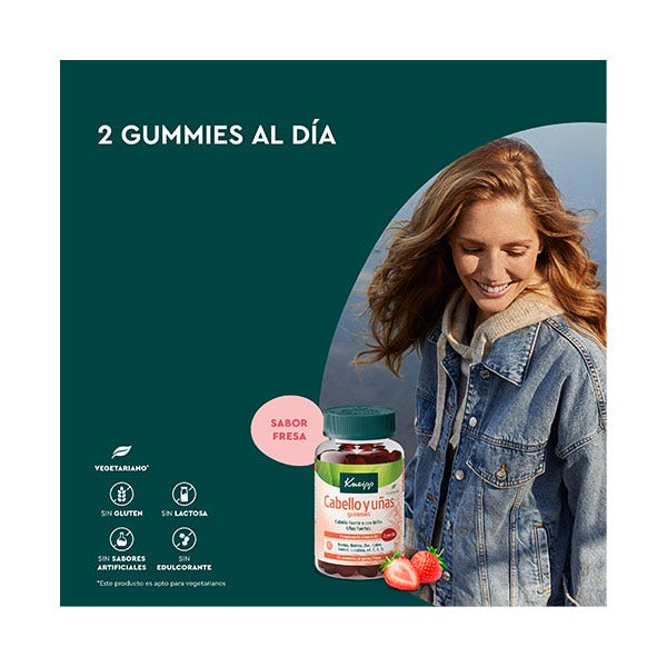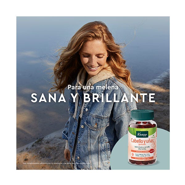 Kneipp Gummies Cabello y Uñas contribuye a un cabello fuerte y con brillo, y a unas uñas fuertes. Con Biotina, Vitamina B3, Vitamina E, Cobre, Zinc, Selenio, L-cisteína y Bambú.