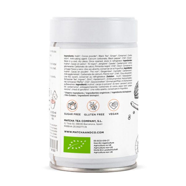 Té negro ecológico, canela ecológica, jengibre ecológico, cacao en polvo ecológico, cardamomo ecológico, inulina ecológica, otras especias. Almacenar en un lugar fresco y seco.