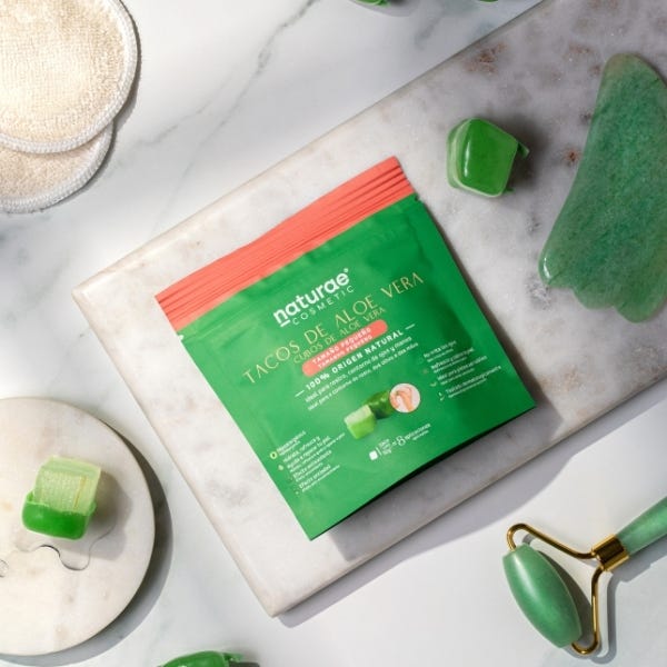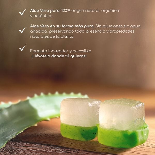Elaborados con pulpa pura de Aloe Vera, en forma de cubo y recubiertos con una cera natural, estos tacos conservan toda la esencia y propiedades de la planta, sin agua añadida más que la propia del Aloe Vera.