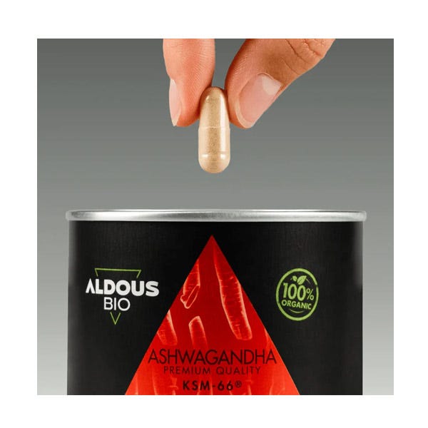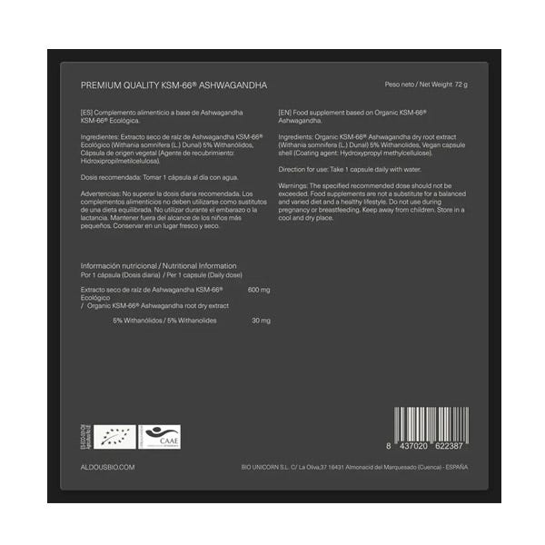 El Extracto de Raíz de Ashwagandha KSM-66 ® Aldous Bio es un complemento alimenticio con Certificación Ecológica Oficial cultivado con agua de gran pureza y libre de residuos tóxicos procedentes de pesticidas, fertilizantes sintéticos, aditivos y conservantes.