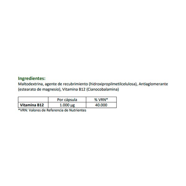 Ingredientes: Maltodextrina, agente de recubrimiento (hidroxipropilmetilcelulosa), Antiaglomerante (estearato de magnesio), Vitamina B12 (Cianocobalamina)