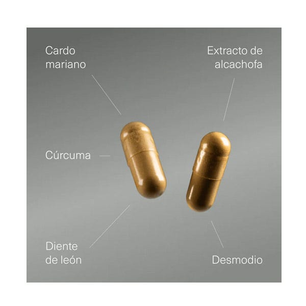 Extracto de cardo mariano (Silybum marianum (L.) Gaertn.), Extracto de alcachofa, Extracto de cúrcuma longa, Cápsula vegetal (agente de recubrimiento (hidroxipropilmetilcelulosa)), Extracto de raíz de diente de león, Extracto de desmodium.