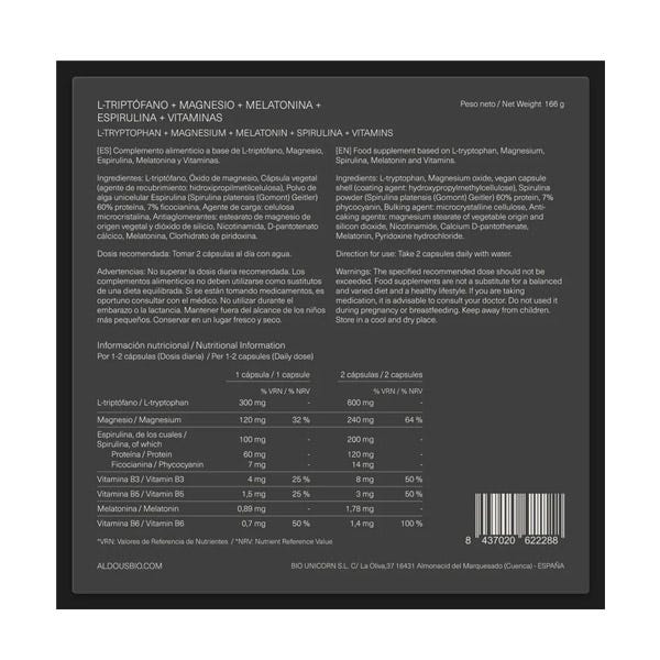 La formulación avanzada de Aldous está compuesta por L-Triptófano con Melatonina, Magnesio, Espirulina y Vitaminas B. Se presenta en un envase de 200 cápsulas vegetales de 830 mg cada una. Nuestro Triptófano se presenta en cápsulas vegetales que aportan una mayor concentración y pureza y una máxima absorción y fácil digestión del producto.