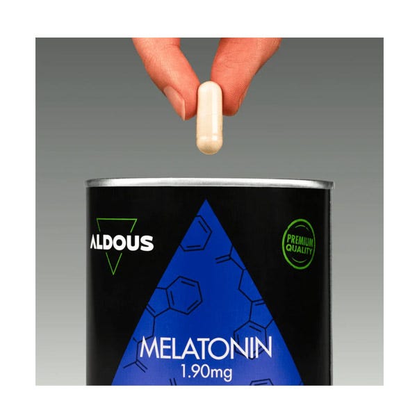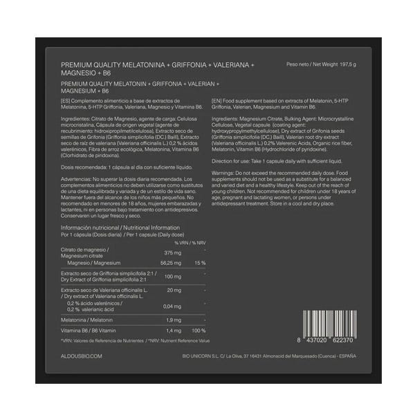 La potente combinación de Melatonina con Magnesio, Griffonia, Valeriana y Vitamina B6 de Aldous se presenta en un envase de 250 cápsulas vegetales para prolongar su consumo durante 250 noches.