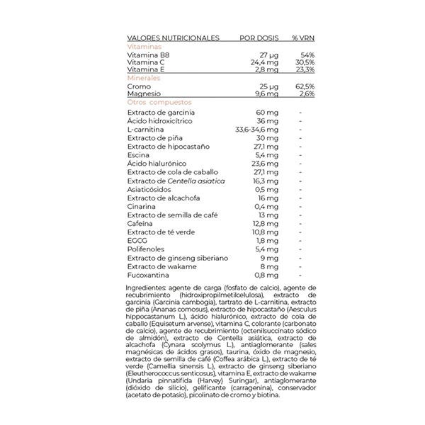 Cafeína, té verde, piña, cártamo, ácido hialurónico, alcachofa, wakame