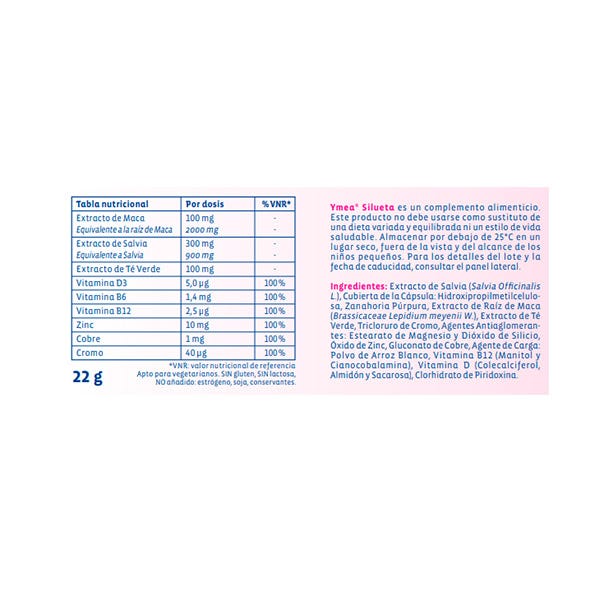 Extracto de Salvia (Salvia Officinalis L.), Cubierta de la Cápsula, Hidroxipropilmetilcelulosa, Zanahoria Púrpura, Extracto de Raíz de Maca (Brassicaceae Lepidium meyenii W.), Extracto de Té Verde, Tricloruro de Cromo, Agentes Antiaflomerantes: Estearato de Magnesio y Dióxido de Silicio, Óxido de Zinc, Gluconato de Cobre, Agente de Carga: Polvo de Arroz Blanco, Vitamina B12 (Manitol y Cianocobalamina), Vitamina D (Colecalciferol, Almidón y Sacarosa), Clorhidrato de Piridoxina.