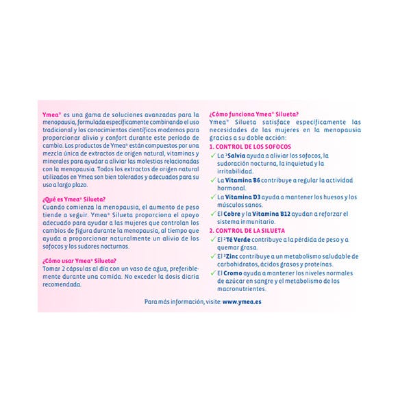 Los productos de Ymea están compuestos por una mezcla única de extractos de origen natural, vitaminas y minerales para ayudar a aliviar las molestias relacionadas con la menopausia.