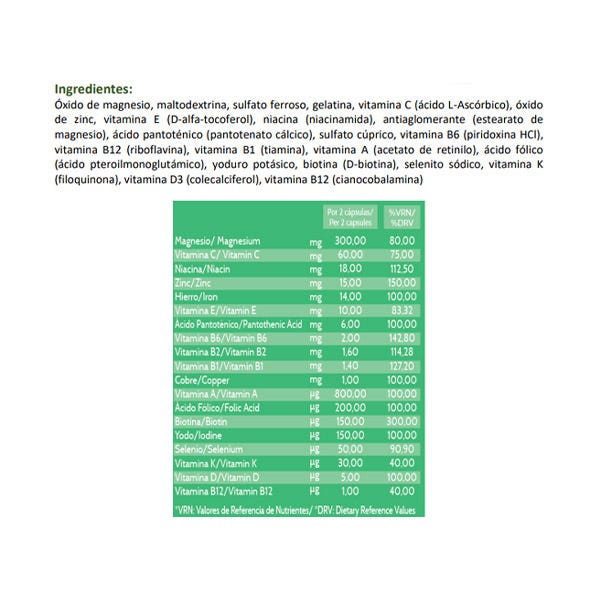 Ingredientes: Óxido de magnesio, maltodextrina, sulfato ferroso, gelatina, vitamina C (ácido L-Ascórbico), óxido de zinc, vitamina E (D-alfa-tocoferol), niacina (niacinamida), antiaglomerante (estearato de magnesio), ácido pantoténico (pantotenato cálcico), sulfato cúprico, vitamina B6 (piridoxina HCl), vitamina B12 (riboflavina), vitamina B1 (tiamina), vitamina A (acetato de retinilo), ácido fólico (ácido pteroilmonoglutámico), yoduro potásico, biotina (D-biotina), selenito sódico, vitamina K (filoquinona), vitamina D3 (colecalciferol), vitamina B12 (cianocobalamina)