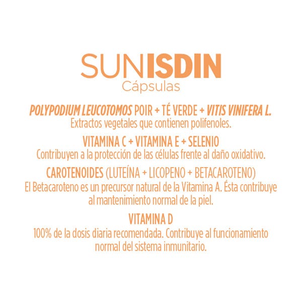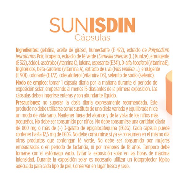 Sun Isdin Cápsulas es un complemento alimenticio nutriprotector que prepara la piel para la exposición solar.