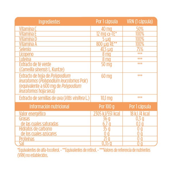 Gelatina, aceite de girasol, humectante (E 422), extracto de Polypodium leucotomos Poir, licopeno, extracto de té verde (Camellia sinensis (L.) Kuntze), emulgente (E 322), ácido L-ascórbico (vitamina C), luteína, espesante (E 341), D-alfa-tocoferol (vitamina E), triglicéridos, beta-caroteno (vitamina A), extracto de uva (Vitis vinifera L.), emulgente (E 901), colorante (E 172), colecalciferol (vitamina D3), selenito de sodio (selenio).