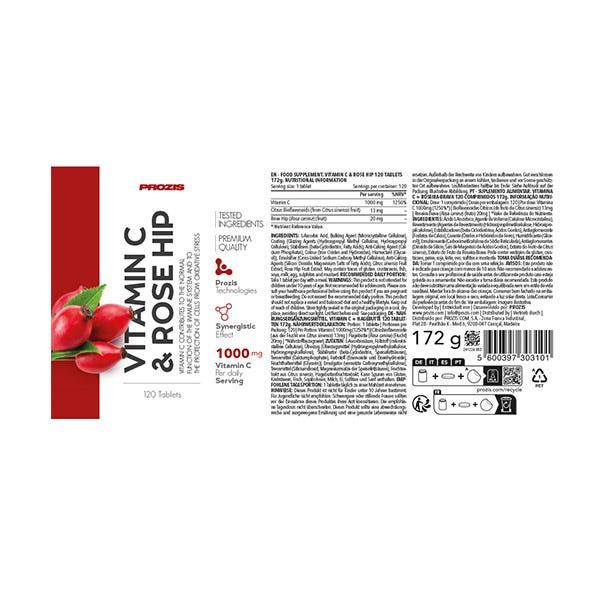 Ácido L-Ascórbico, Agente de Carga (Celulosa microcristalina), Cobertura (Agentes de recubrimiento (Hidroxipropilmetilcelulosa, Hidroxipropilcelulosa), Estabilizantes (Beta-ciclodextrina, Ácidos grasos), Antiaglomerante (Fosfatos de Calcio), Colorante (Óxidos e Hidróxidos de Hierro), Humectante (Glicerina)), Emulgente (Carboximetilcelulosa Sódica Entrelazada), Antiaglomerantes (Dióxido de Silicio, Sales Magnésicas de Ácidos Grasos), Extracto de Fruto de Citrus sinensis, Extracto de Fruto de Rosa Silvestre. Puede contener trazas de gluten, crustáceos, pescado, soja, leche, huevo, sulfitos y mostaza.