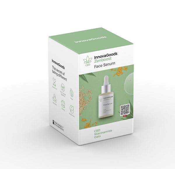 El sérum facial Zenboost InnovaGoods CBD nutre, calma, reduce rojeces y arrugas, hidrata, tonifica, revitaliza e ilumina la piel. Contiene ingredientes naturales. Principios activos: CBD, niacinamida, avena, caléndula, ácido hialurónico y Symcalmin®.