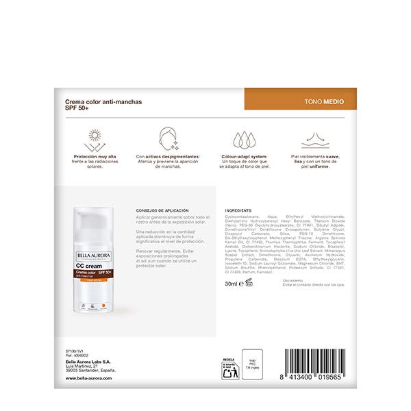 Crema color antimanchas SPF50+ tono medio.