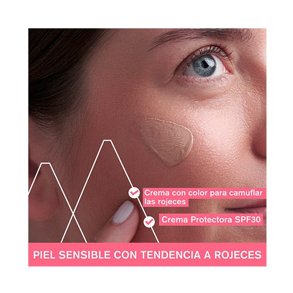 Disimula las rojeces, uniformiza e ilumina la tez y la protege de los rayos UV gracias a su SPF30.