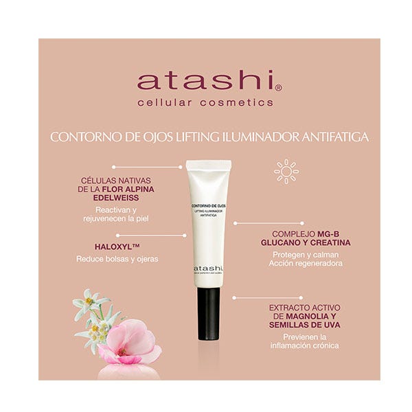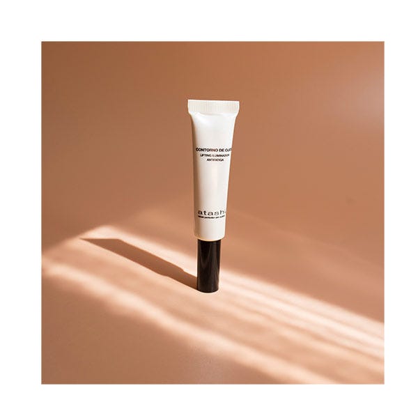 Atashi contorno de ojos efecto lifting que rejuvenece, nutre y reafirma el contorno al mismo tiempo que reduce las bolsas y cubre ligeramente las ojeras gracias a sus pigmentos iluminadores. ¡Consigue una mirada visiblemente más joven y luminosa en un solo gesto!
