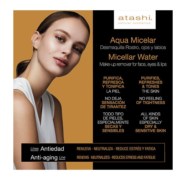 El aqua micelar atashi cellular cosmetics es un desmaquillante para el rostro, ojos y labios de las pieles más sensibles y secas.