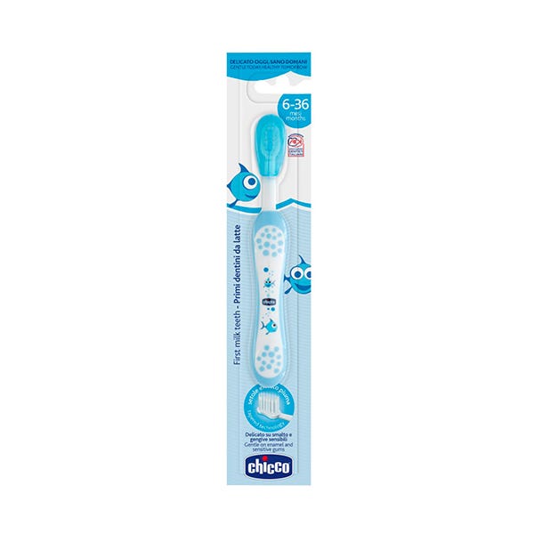El cepillo infantil de Chicco está diseñado para la facilitar la higiene oral del pequeño. Delicado con las encías. Con cerdas ultra finas con acabado efecto pluma. De 6 a 36 meses. Color azul.