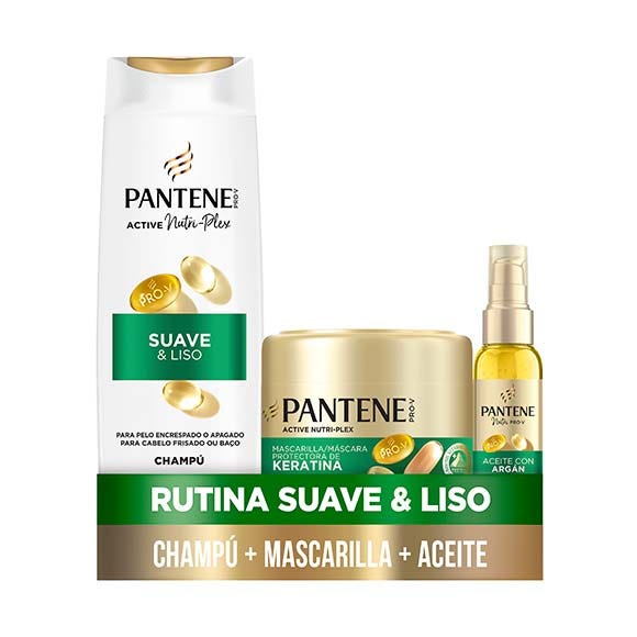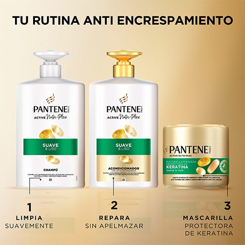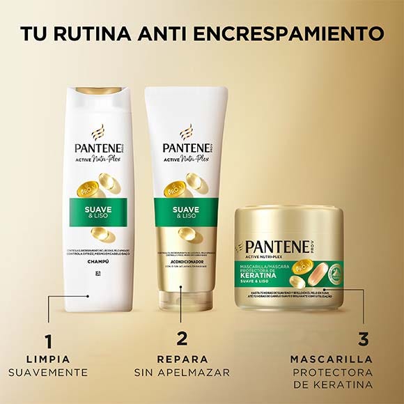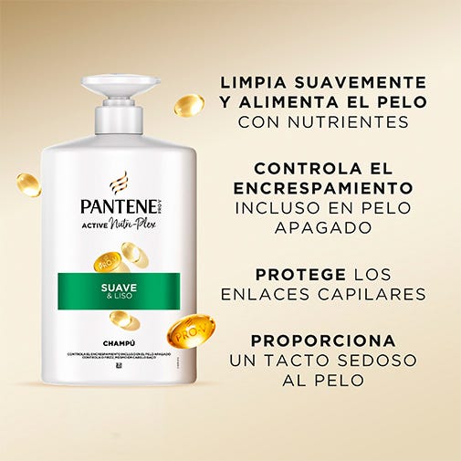 Descubre el champú Pantene Suave y Liso, el secreto para un pelo liso y brillante. Nuestra fórmula suave, con PRO-V y la innovadora tecnología ACTIVE NUTRI-PLEX, limpia tu pelo y le aporta nutrientes esenciales. Hidrata el pelo apagado, combate la aspereza y controla el encrespamiento, dejando tu pelo suave y sedoso. Testado por el Instituto Vitamínico Suizo. Experimenta lo último en cuidado capilar con el champú Pantene Pro-V Active Nutri-Plex Suave y Liso.