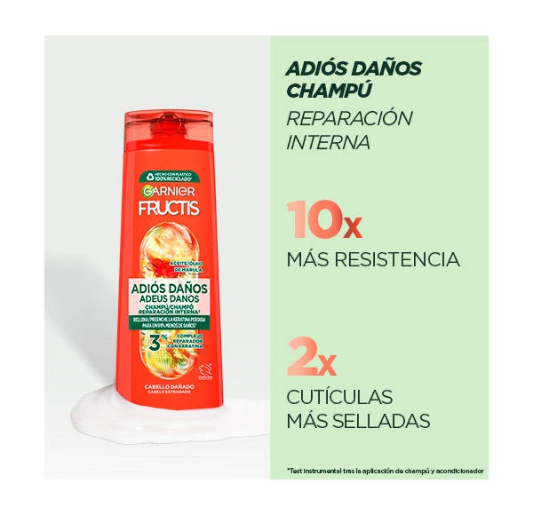 El champú fortificante Garnier Fructis Adiós Daños es la solución para poder decirle adiós al cabello muy dañado o desvitalizado. Su fórmula con Keraphyll y Aceite de fruto de Amla repara los daños del cabello desde el interior.