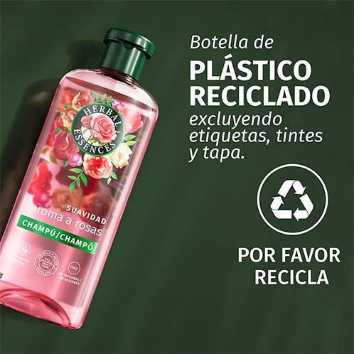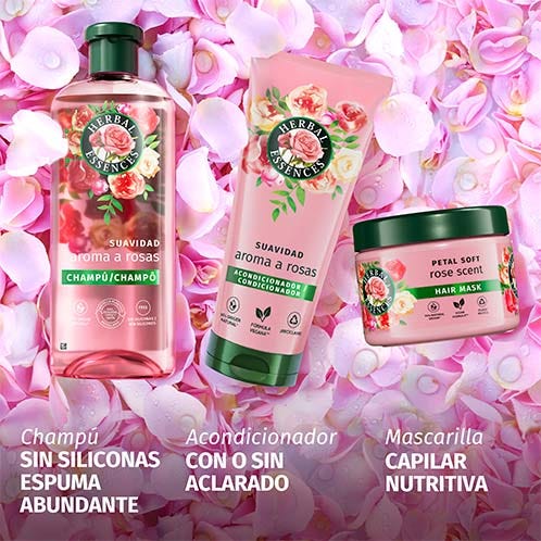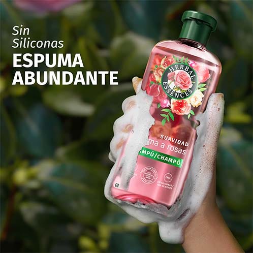 Prepárate para días de color de rosa. Herbal Essences Champú Suavidad Aroma a Rosas ayuda a trasformar el pelo seco en un pelo rico y sedoso. Déjate envolver en su fragancia floral. Al mezclar nutrientes de origen vegetal infusionados con esencia de rosa auténtica, cosechada a mano en Grasse, en el sur de Francia, obtenemos una fórmula vegana y sin siliconas que forma una dulce espuma para una limpieza y profunda hidratación del pelo seco