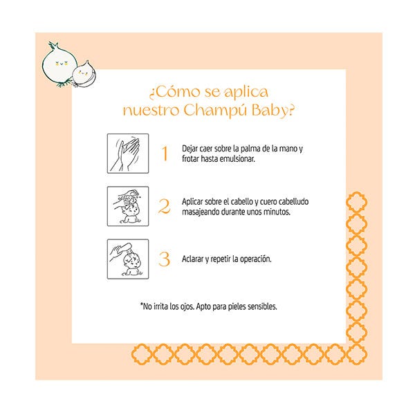 Aplicar suavemente sobre el cabello y cuero cabelludo del bebé, masajear durante unos minutos y aclarar bien.
