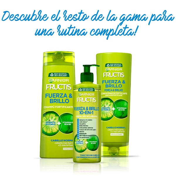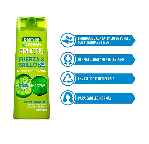 El champú fortificante Fuerza y Brillo de Fructis gracias a su fórmula con activos fortificantes de frutas, tonifica la fibra del pelo desde la raíz. Gracias a su fórmula compuesta por esencia de pomelo con vitaminas B3 y B6 consigue que tu pelo luzca más fuerte, brillante y fresco.