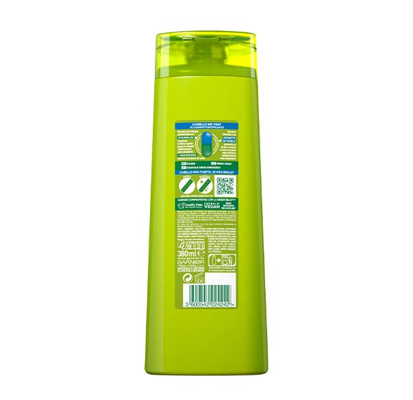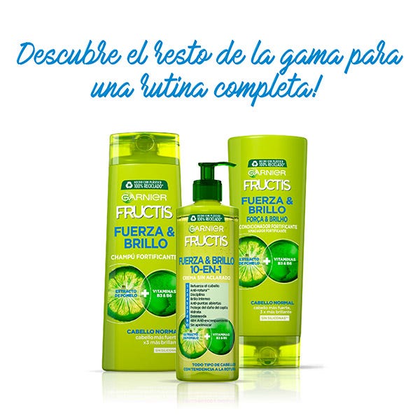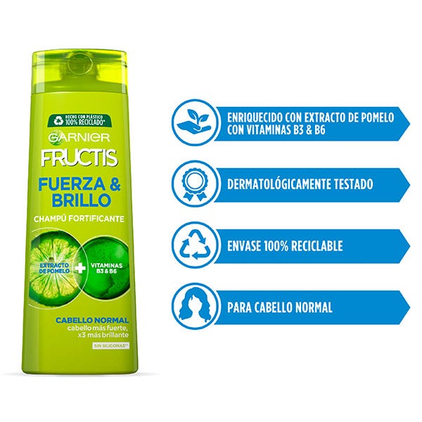 El champú Fructis Fuerza y Brillo es un champú fortificante enriquecido con esencia de pomelo y vitaminas B3 y B6 para limpiar, fortificar y tonificar la fibra del cabello desde la raíz.