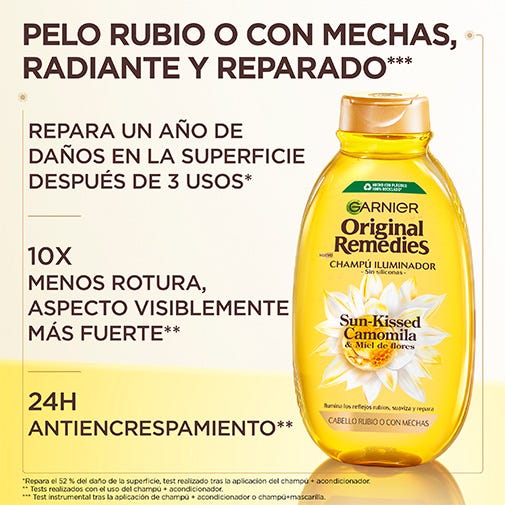 Redescubre el brillo natural de tu rubio con el cuidado iluminador de Garnier Sun-Kissed Camomila. Enriquecido con camomila y miel de flores, este champú proporciona un baño de luz que ilumina los reflejos, suaviza la fibra capilar y ayuda a reparar el pelo visiblemente dañado*.
